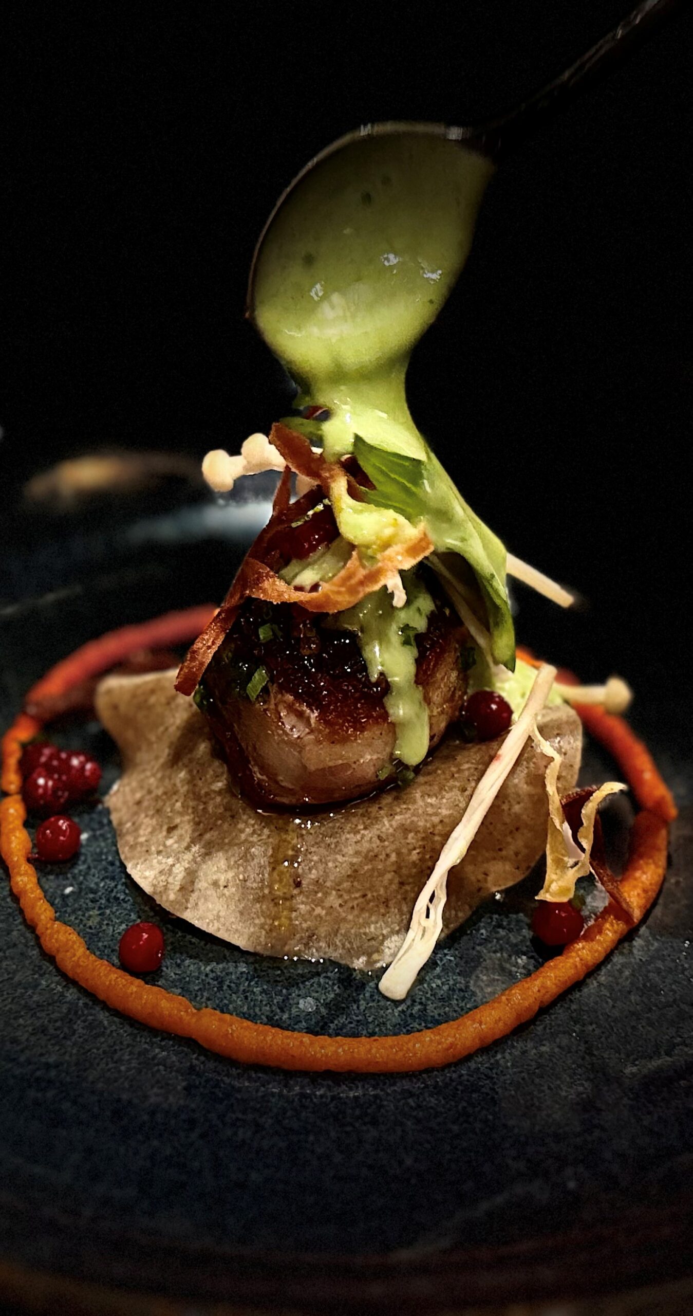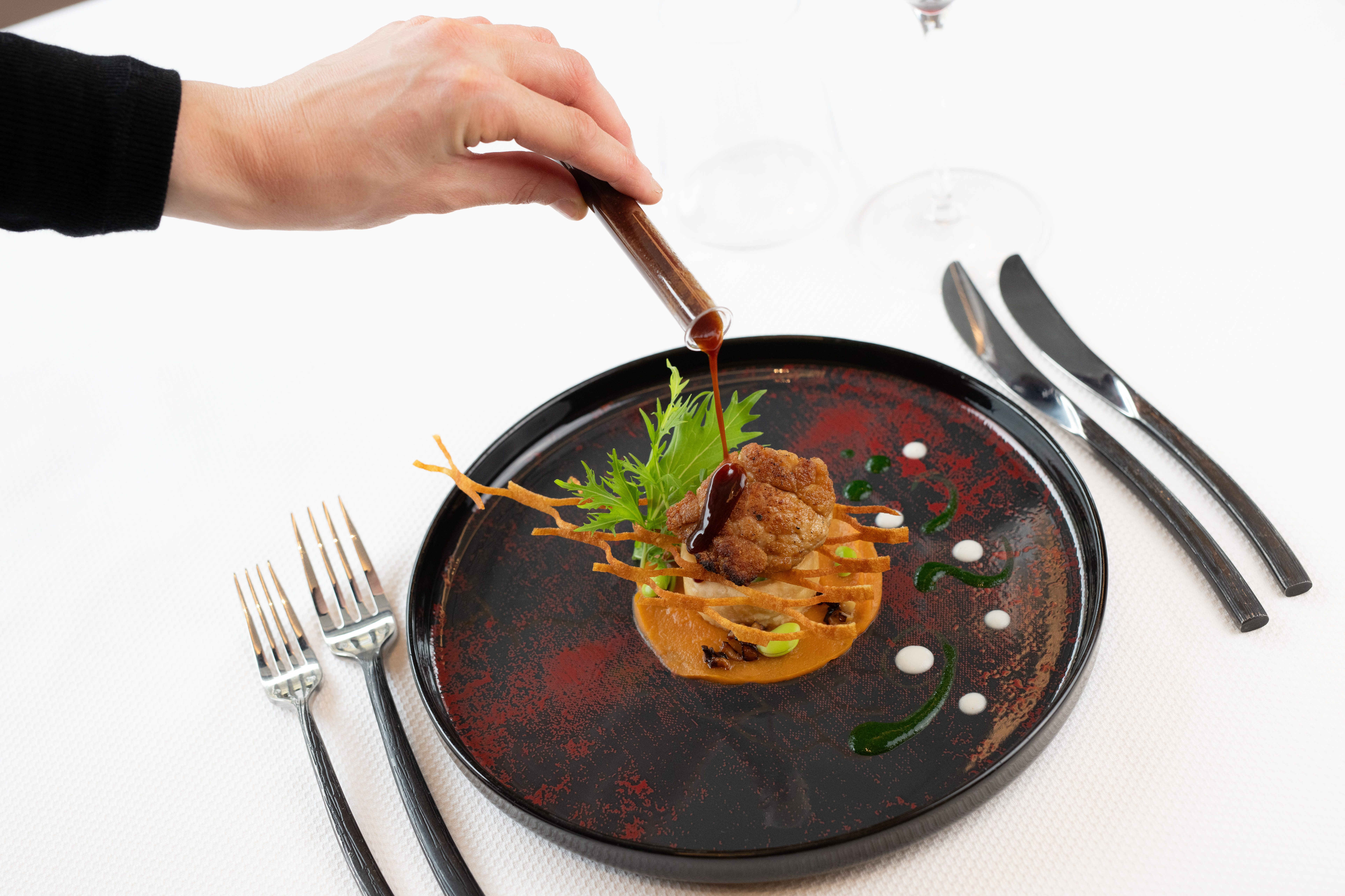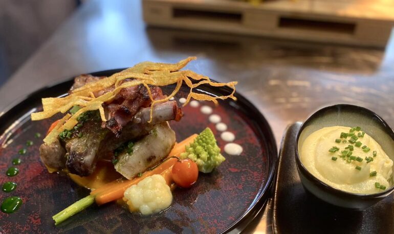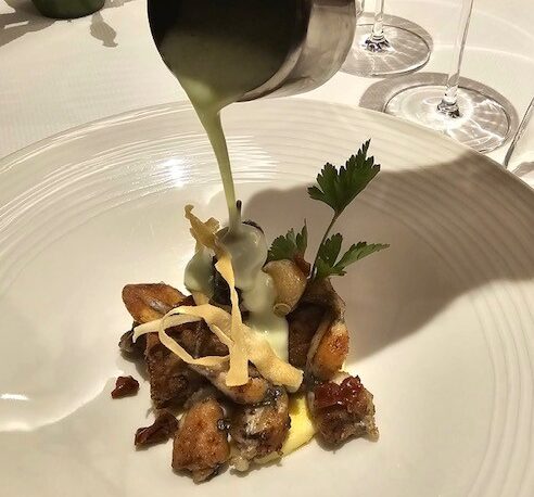Escorté de ses salpicons de poulpe rôtis et jambon de « Pata Negra », nage crémeuse de topinambours, éclats de noisettes et gnocchis croustillants…