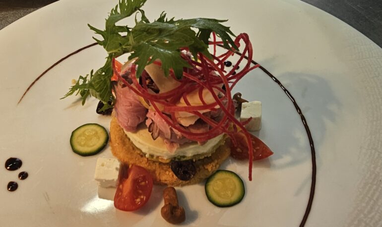 Filet de bœuf grillé minute en mille-feuille de foie gras chaud