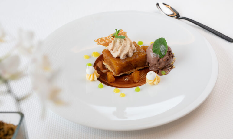 Fruits exotiques et frécinette caramélisée, crémeux pistaché et crème anglaise, glace macadamia…